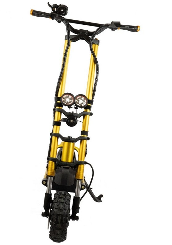 KAABO Wolf King+ vyniká robustním a odolným designem, který okamžitě zaujme každého milovníka kvalitních elektrických koloběžek. Koloběžka je vybavena dvojitým rámem z leteckého hliníku, který zaručuje vysokou pevnost. Díky zlatému anodizovanému povrchu působí luxusně a stylově a zároveň je odolná proti korozi a poškození. Koloběžka má 11palcové terénní pneumatiky, které poskytují vynikající trakci a stabilitu na různých površích, ať už se jedná o asfalt, štěrk, trávu či jiné náročné terény. Přední hydraulické tlumiče doplněné pružinou vzadu přispívají k pohodlné a plynulé jízdě i na nerovném terénu. 2 přední světlomety, 2 přední LED světla, boční LED osvětlení a zadní brzdová světla zajišťují vynikající viditelnost za všech podmínek, což přispívá ke zvýšení bezpečnosti.