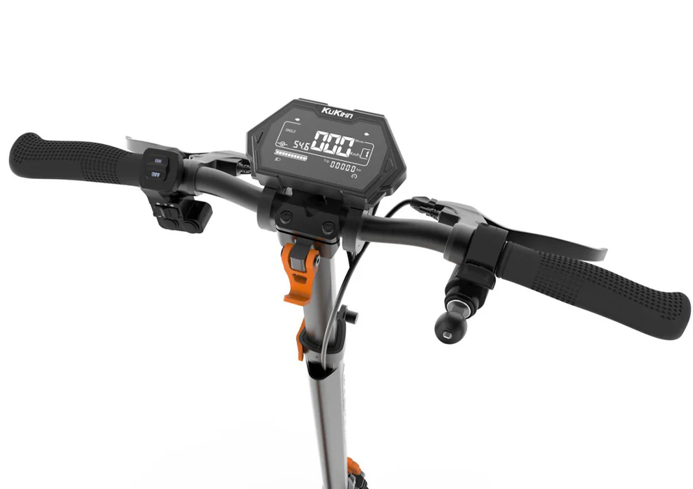 KuKirin G2 Max zaujme na první pohled moderním sportovním designem, který kombinuje robustní konstrukci s elegantními liniemi. Díky kvalitnímu rámu je koloběžka nejen esteticky atraktivní, ale i mimořádně odolná vůči každodennímu používání. Její rozměry v rozloženém stavu jsou 1260 × 605 × 1300 mm, a ve složeném stavu 1260 × 605 × 580 mm, skladování a přenášení tedy nejsou problémem. Hmotnost přibližně 31 kg zaručuje pevnost a stabilitu a zároveň umožňuje snadnou manipulaci. Pohodlnou jízdu zajišťuje čtyřramenný systém tlumení v kombinaci s 10palcovými off-road pneumatikami odolnými proti opotřebení a nárazům. KuKirin G2 Max je vybavena odnímatelným sedadlem pro extra komfort při delších cestách. Šestibodový světelný systém zahrnuje silné přední světlo, boční osvětlení, zadní a brzdová světla, takže budete dokonale viditelní ve dne i v noci. Praktický inteligentní displej zobrazuje rychlost, stav baterie a umožňuje snadné ovládání světel, blinkrů a klaksonu.