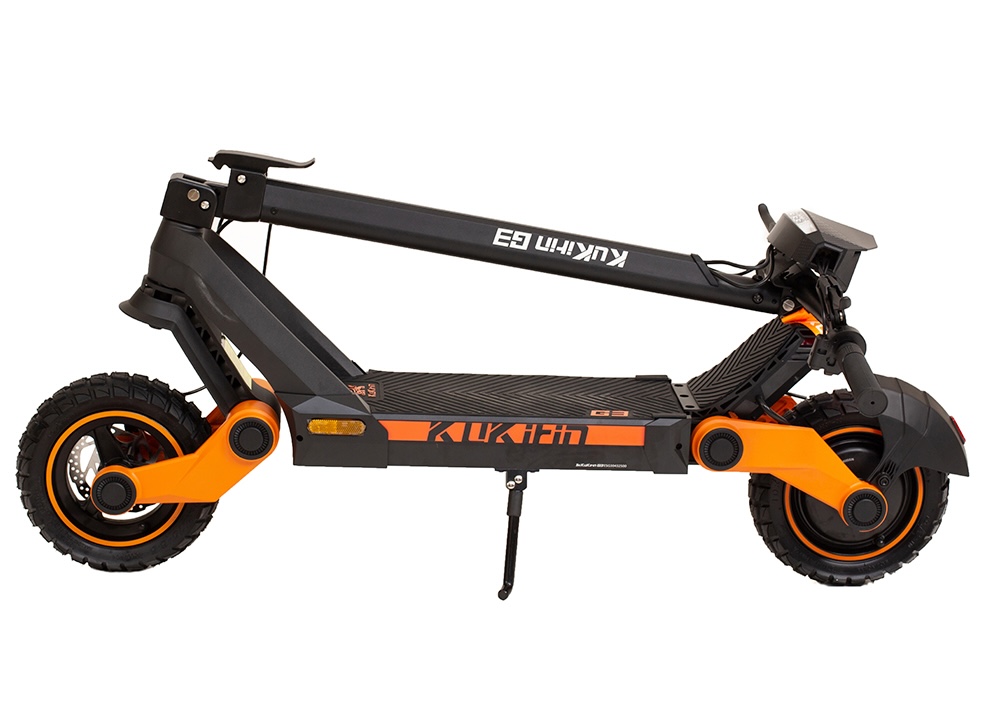 KuKirin G3 je navržena tak, aby kombinovala robustní vzhled, funkčnost a komfort při jízdě. Rám z odolné hliníkové slitiny nemá žádné svařované spoje, což zaručuje vyšší pevnost a delší životnost. Rozměry koloběžky jsou 1190 × 1295 × 660 mm v rozloženém stavu a 1190 × 550 × 660 mm ve složeném stavu, což usnadňuje její uskladnění a převoz. Koloběžka disponuje 10,5″ terénními pneumatikami, které poskytují stabilitu a trakci i na nerovném povrchu. O pohodlí jízdy se stará speciální TPU odpružení se čtyřramenným tlumicím systémem inspirovaným pohybem geparda. Pro lepší orientaci během jízdy je osazena LED displejem o rozměrech 155 × 55 mm, který zobrazuje všechny důležité údaje, včetně rychlosti, stavu baterie, režimu jízdy a osvětlení. Integrovaný osvětlovací systém se šesti světly zahrnuje 3W přední reflektor s úhlem 60°, zadní brzdové světlo a čtyři směrové blinkry, což zvyšuje bezpečnost při nočních jízdách.
