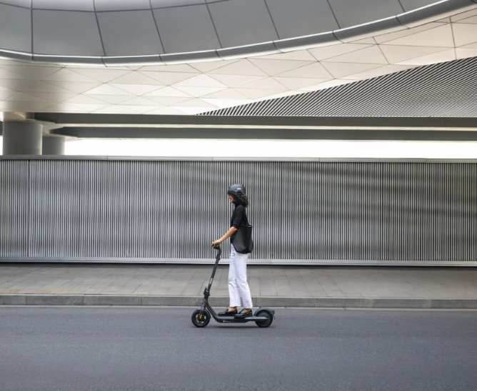 Ninebot KickScooter E2 Pro E je koncipována tak, aby byly každodenní městské přesuny co nejkomfortnější a zároveň nenáročné na údržbu. Díky nosnosti 100 kg a prostorově komfortní platformě je koloběžka vhodná pro široké spektrum jezdců, od studentů přes zaměstnance až po rekreační jezdce. Bezdušové 10palcové pneumatiky nevyžadují pravidelné dofukování a zároveň se vyznačují vysokou schopností absorbovat vibrace, což snižuje opotřebení komponentů. Jelikož tento model nepoužívá mechanické odpružení, právě kvalitní kola jsou hlavním prvkem, který zlepšuje komfort a filtruje nerovnosti. Koloběžka disponuje certifikací IPX4, baterie dokonce IPX6, takže ji lze používat i v deštivém počasí bez obav z poškození elektroniky. Skládací mechanismus umožňuje velmi rychlý přechod ze složeného do jízdního stavu, což je ideální při přesunech mezi dopravními prostředky. Koloběžka se jednoduše přenáší díky kompaktnímu tvaru, ačkoli její hmotnost 18,8 kg ji řadí spíše mezi stabilní, méně přenosné modely. Z hlediska údržby patří E2 Pro E mezi nenáročné koloběžky – brzdný systém se skládá z robustní přední bubnové brzdy, která se nepřehřívá a nevyžaduje časté seřizování, a zadní elektronické brzdy, která využívá rekuperaci. Mobilní aplikace poskytuje přehled o technickém stavu koloběžky, upozorní na potřebu aktualizace či možný problém s baterií. Nabíjení trvá přibližně 5,5 hodiny, což znamená, že koloběžka je při správném plánování prakticky připravena k dennímu používání.