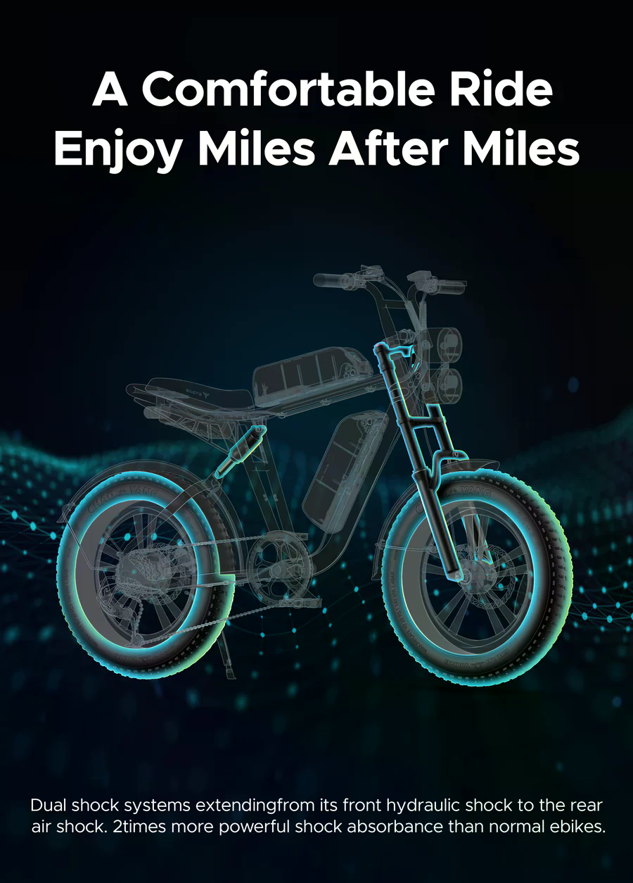 Design modelu ENGWE M20 patří mezi jeho nejvýraznější přednosti. Kombinuje retro motocyklový vzhled s moderními e-bike technologiemi a robustní konstrukcí rámu. Rám je vyroben z odolné hliníkové slitiny 6061 Aluminum Alloy, která zvládá vyšší zatížení, nárazy i dlouhodobé používání v různých podmínkách. Zatímco většina městských e-biků sází na minimalistický a lehký design, M20 klade důraz na pocit pevnosti, stability a motocyklového charakteru. Rozměry kola jsou 167 cm délka, 114 cm výška, 37 cm reach, rozvor 115,2 cm a výška rámu 76,2 cm, což zajišťuje pohodlný posed pro většinu jezdců. Velkým lákadlem je možnost instalace druhé baterie, která se montuje do rámové části a dodává kolu ještě výraznější moto-vzhled. Kvalitu výbavy doplňuje přední hydraulická odpružená vidlice v kombinaci se zadními vzduchovými tlumiči, díky čemuž se jedná o plně odpružený e-bike vhodný i na nerovné cesty. Silné přední LED světlo zajišťuje kvalitní osvětlení, pneumatiky 20×4.0" (fat tyres) poskytují výbornou trakci a jistotu při jízdě, zatímco mechanické 160mm kotoučové brzdy vpředu i vzadu zajišťují spolehlivé brzdění. Výhodou je také 7rychlostní převodovka, která umožňuje plynulé přizpůsobení stylu jízdy různým podmínkám.