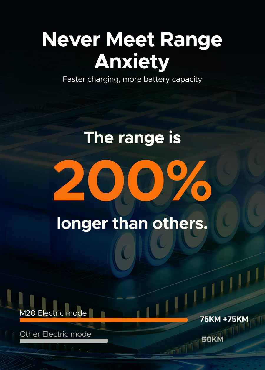 Ve srovnání s ostatními modely značky ENGWE má M20 jedinečný charakter. Zatímco modely jako ENGWE EP-2 Pro nebo Engine Pro jsou spíše univerzální skládací e-biky, M20 cílí na jezdce, kteří chtějí motocyklový vzhled, robustní odpružení a možnost instalace dvou baterií. Na rozdíl od skládacích modelů váží 34,8 kg, což je sice více, ale zároveň to přináší vyšší stabilitu. Ve srovnání s výkonnějšími modely značky se jeho motor 750 W / 1000 W peak nachází ve středu nabídky – není nejrychlejší, ale nabízí nejlepší poměr mezi výkonem, dojezdem a cenou. Dojezd 75–150 km je dokonce vyšší než u některých dražších modelů. Nosnost 120 kg, odpružení vpředu i vzadu, pneumatiky 20×4.0 a výrazný rám mu dávají výhodu oproti modelům, které jsou méně zaměřené na design a zážitkovou jízdu. ENGWE M20 tak představuje ideální most mezi městskými e-biky, terénními modely a stylovými moto e-biky.