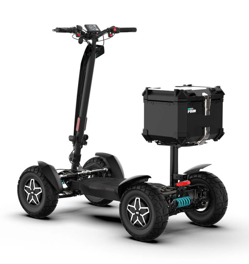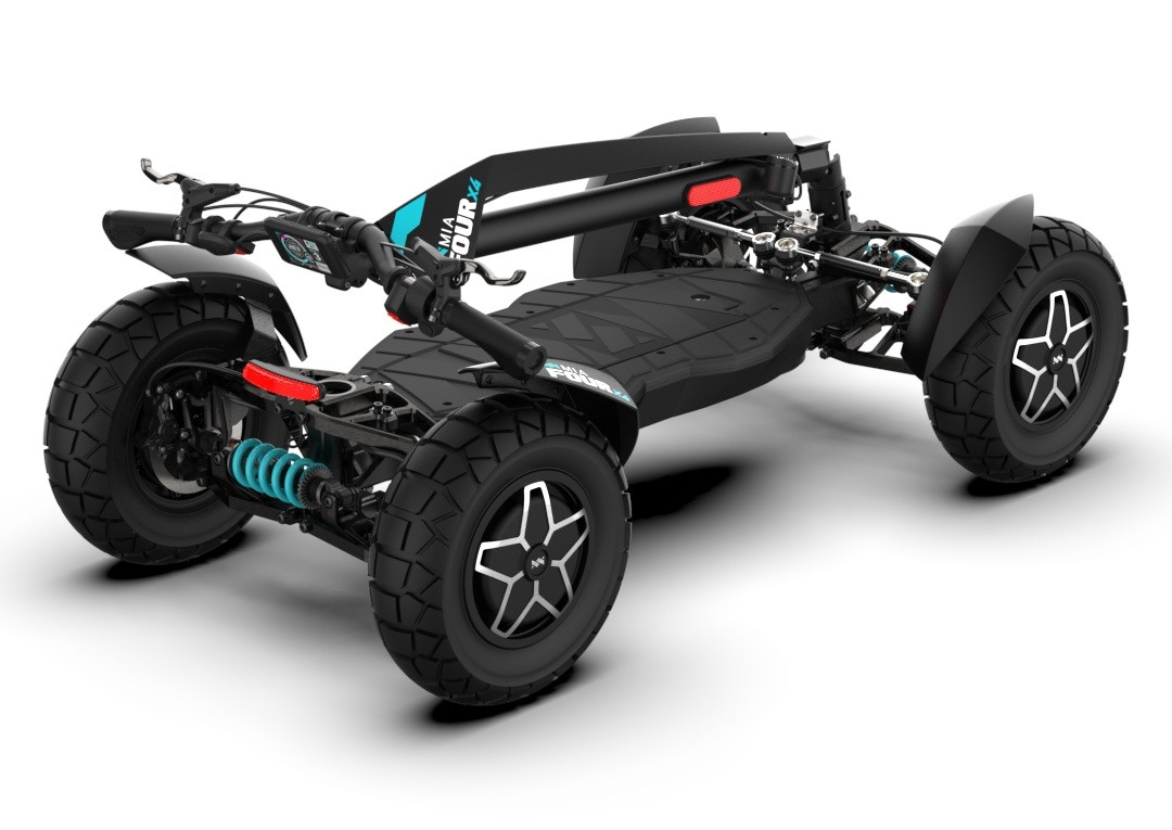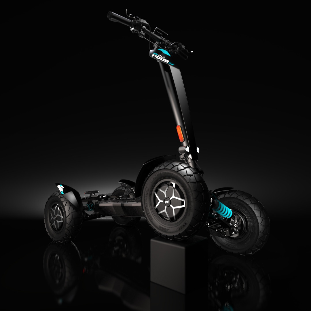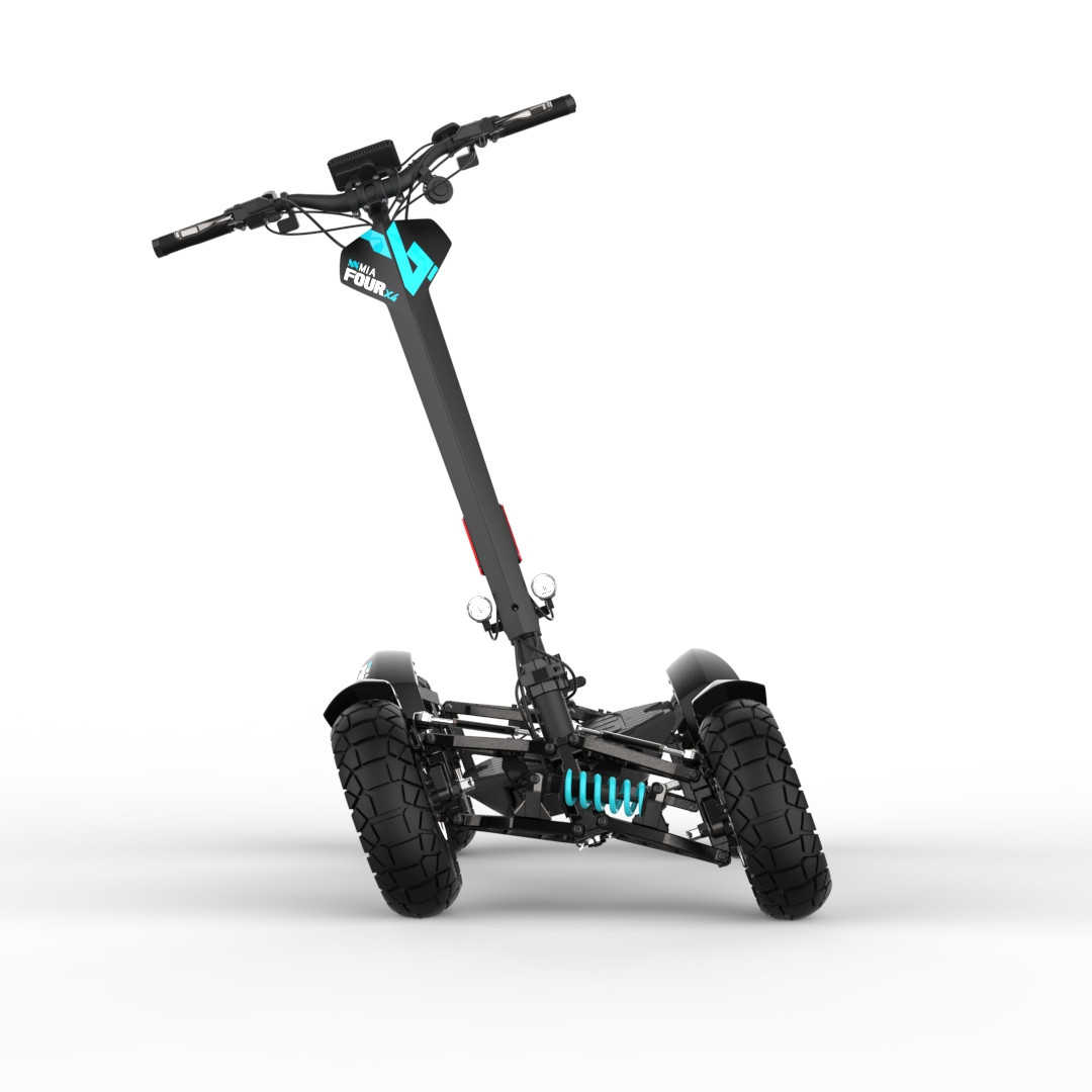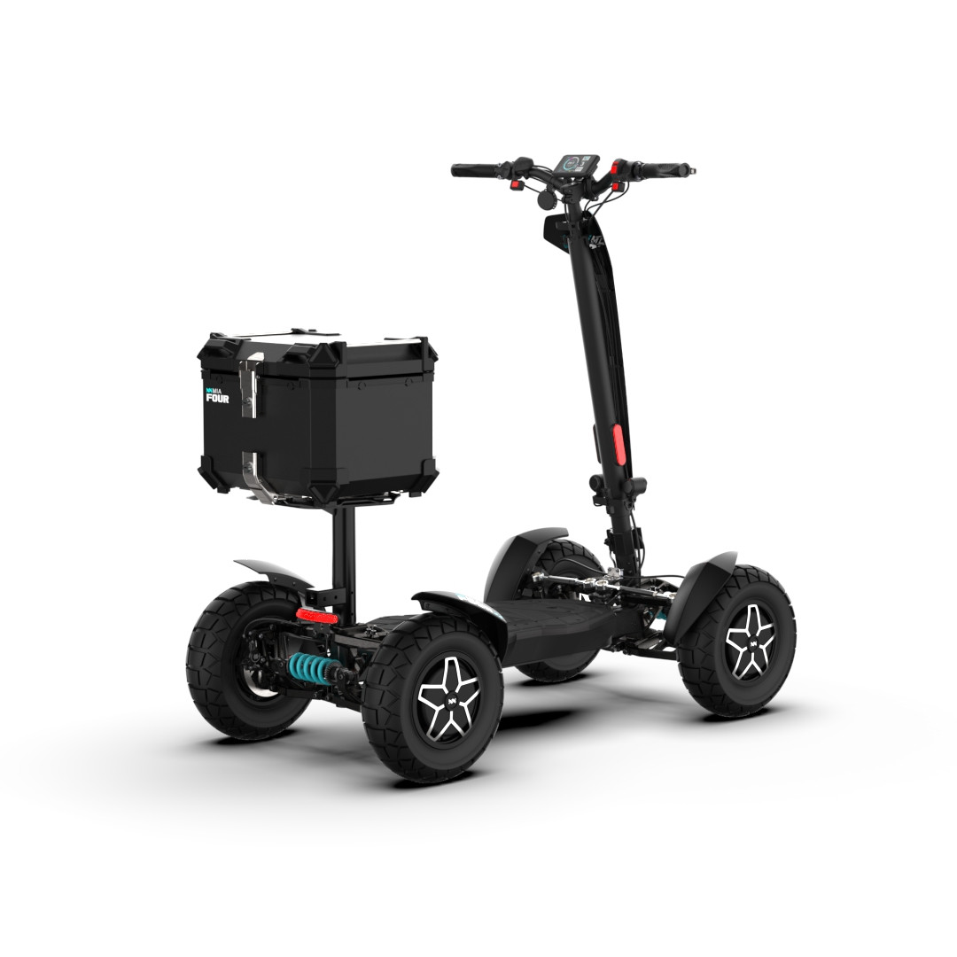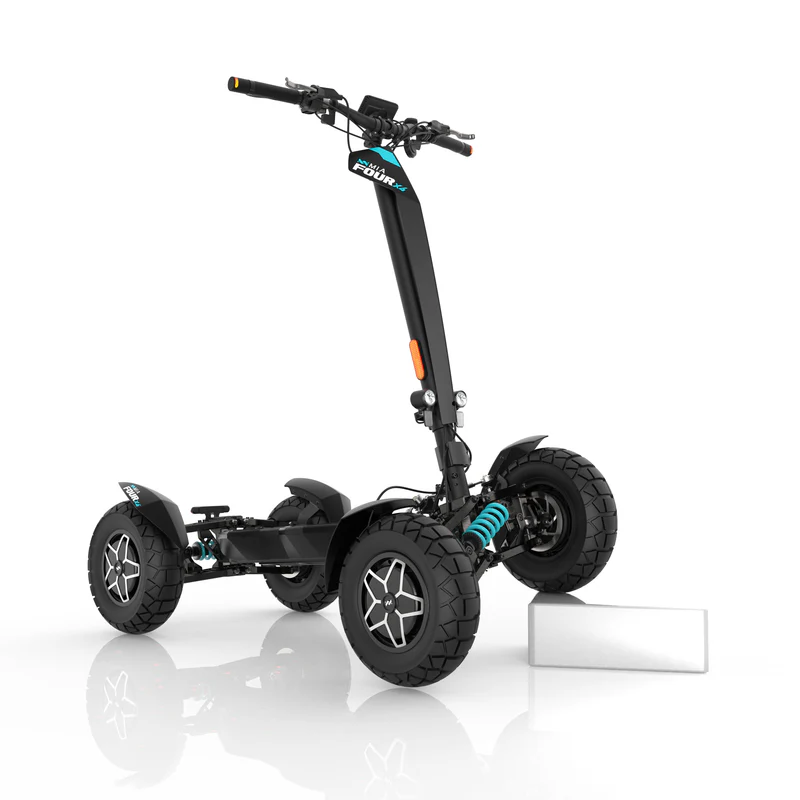 MIA Four X4 (4×4) – revoluční elektrická koloběžka s pohonem všech čtyř kol, výkonem 7200 W, dojezdem až 120 km a robustní baterií 60 V / 35 Ah. Spolehlivá, výkonná a připravená na jakýkoli terén.